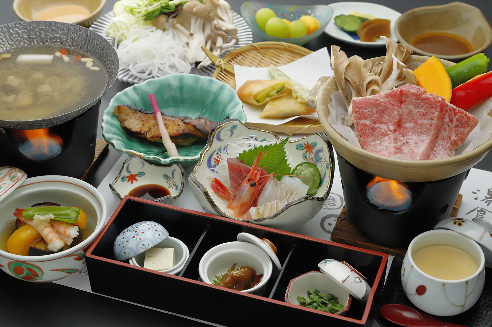 At Ryokan Ohnuma, our meals are thoughtfully crafted using locally sourced rice, water, soybeans, and seasonal ingredients. We offer four course options: 1 Soup & 9 Dishes, 1 Soup & 8 Dishes, 1 Soup & 7 Dishes, and 1 Soup & 5 Dishes. As an additional option, you can also upgrade to brown rice or multigrain rice for an extra fee.