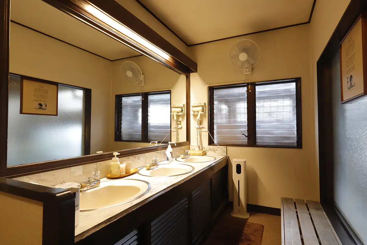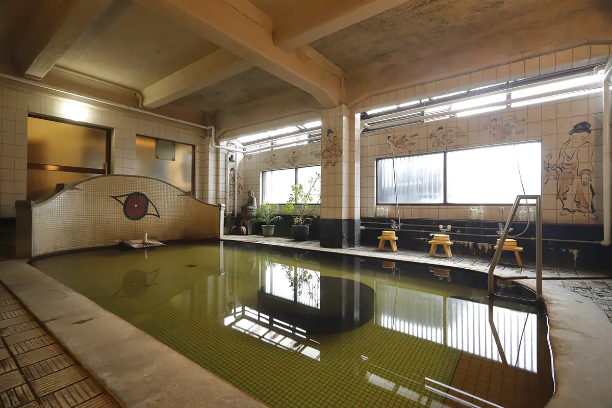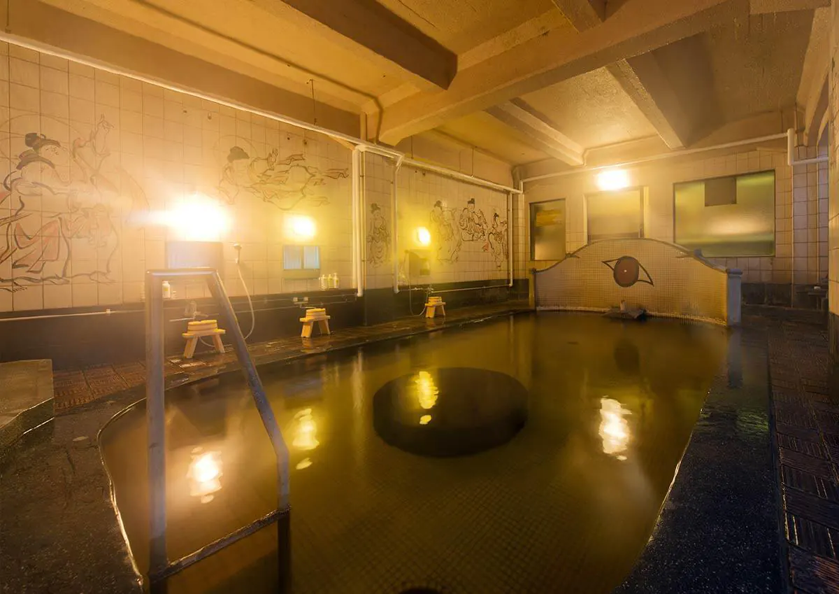 This traditional mixed-gender large bath, with dedicated times for women only, draws from continuously flowing natural springs. Inside the bath, you’ll find stone seats for half-body soaking. The walls are adorned with beautiful paintings of angels by artist Noriko Takahashi, allowing for a peaceful bathing experience.