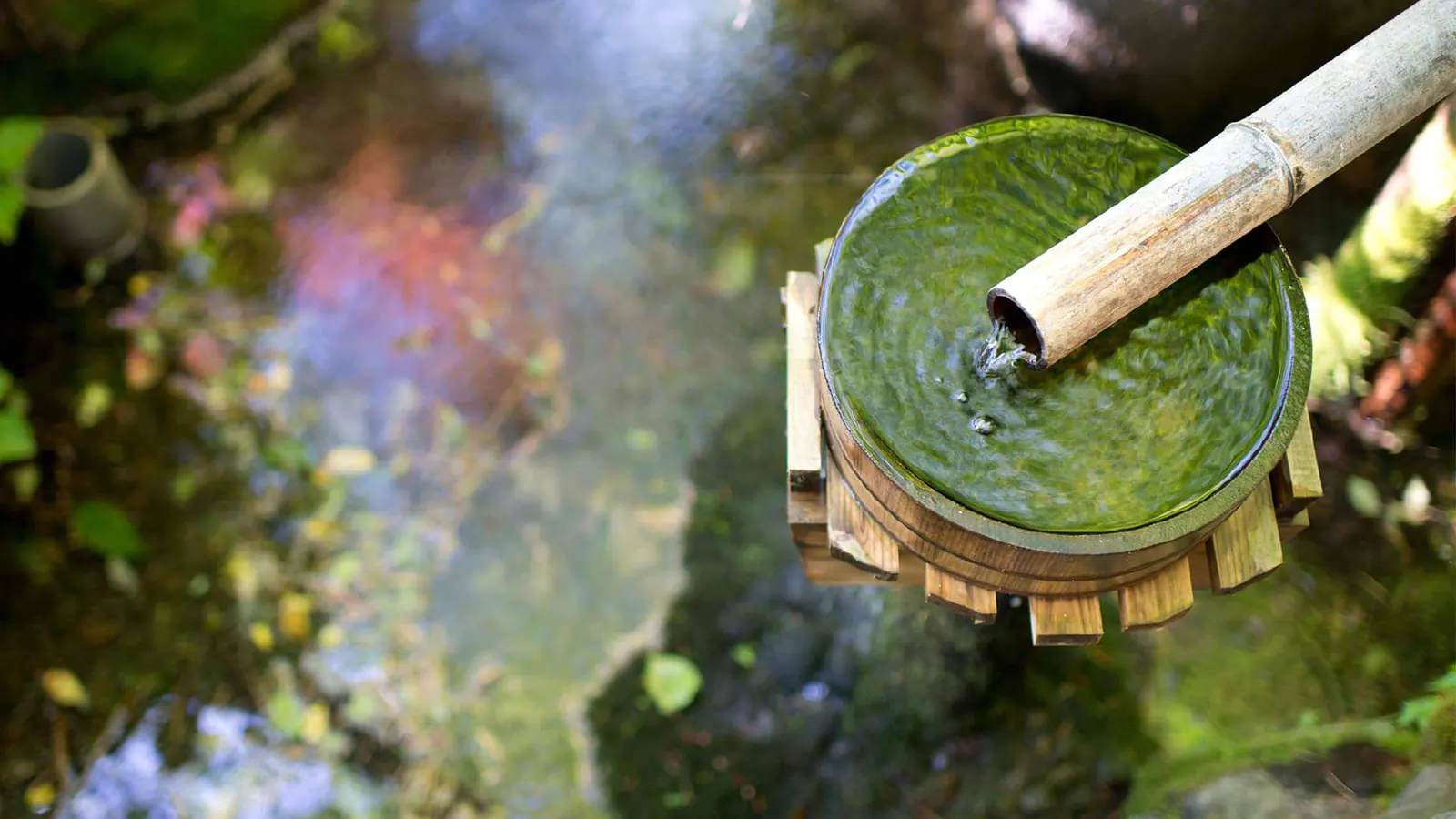 Positioned to face the rising sun, this bath is full of revitalizing energy. The bath is embedded with charcoal bamboo, which enhances the smoothness of the spring water through its far-infrared properties. Rose quartz and larimar gemstones infuse the space with energies of love and peace, making it ideal for those with skin troubles or aches.